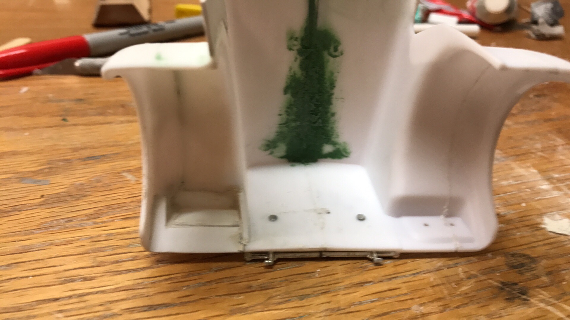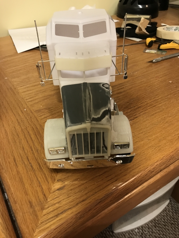 Casey Posted December 16, 2016 Thought I would share the W900l (circa '96) hood I am working on for the snap KW. Hopefully I will wind up with something passable. Since the W900L grill is narrower, I cut a section out of the center of the hood and the grill (not pictured). To ensure that the correct width was maintained at the back of the hood a cut a section from the rear of another hood. The rear portion of the other hood was glued to the rear of the hood and the hood sides have been extended using sheet styrene. In the image above, the fenders have been widened using the outer portion of the other hood's fenders, the headlight "pods" have been removed and filled and the raised portion on the top of the hood has been removed. What's left of the original hood and the new hood. Working on the crowned strip down the center of the hood. Thanks for looking! Feedback is always encouraged and appreciated. --Casey 1 Share this post Link to post Share on other sites