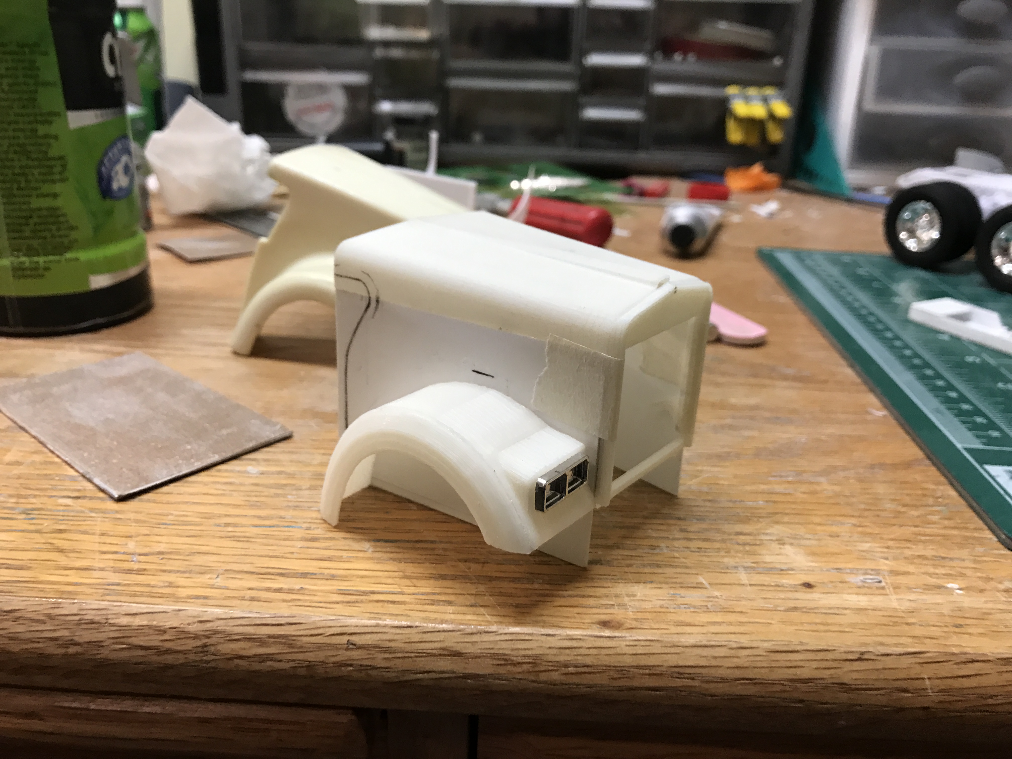 Casey Posted March 6, 2017 I finished the hood and cast the first one a couple of weeks ago only to realize that I made a major error. I somehow managed to make one of the fenders a tiny bit wider than the other. It is not dramatic but is noticeable. Therefore, I decided to start over from scratch. An opportunity to make it better, right? Thus far, I have 3d printed the upper hood, created sides from sheet styrene and have tacked a 3D printed right side fender in place. With not being bound by kit hood top, I was able to add a bit more of a drop to the front of the hood and make the shape of the upper hood more accurate. However, since the kit cab sits about .1" lower than it would for a B model, I was forced to shorten the grill a bit and narrowed it as well to maintain the correct length/width proportions. I was tempted to make it to scale but decided not to because it would force builders to raise the kit's cab in order to achieve the correct fitment and because the rivet counters are likely to be the only ones to notice or care. Ease of use beat accuracy in this case. All in all, I am happy with it and believe that in the end, it will be a much better effort than the first attempt. --Casey 1 Share this post Link to post Share on other sites