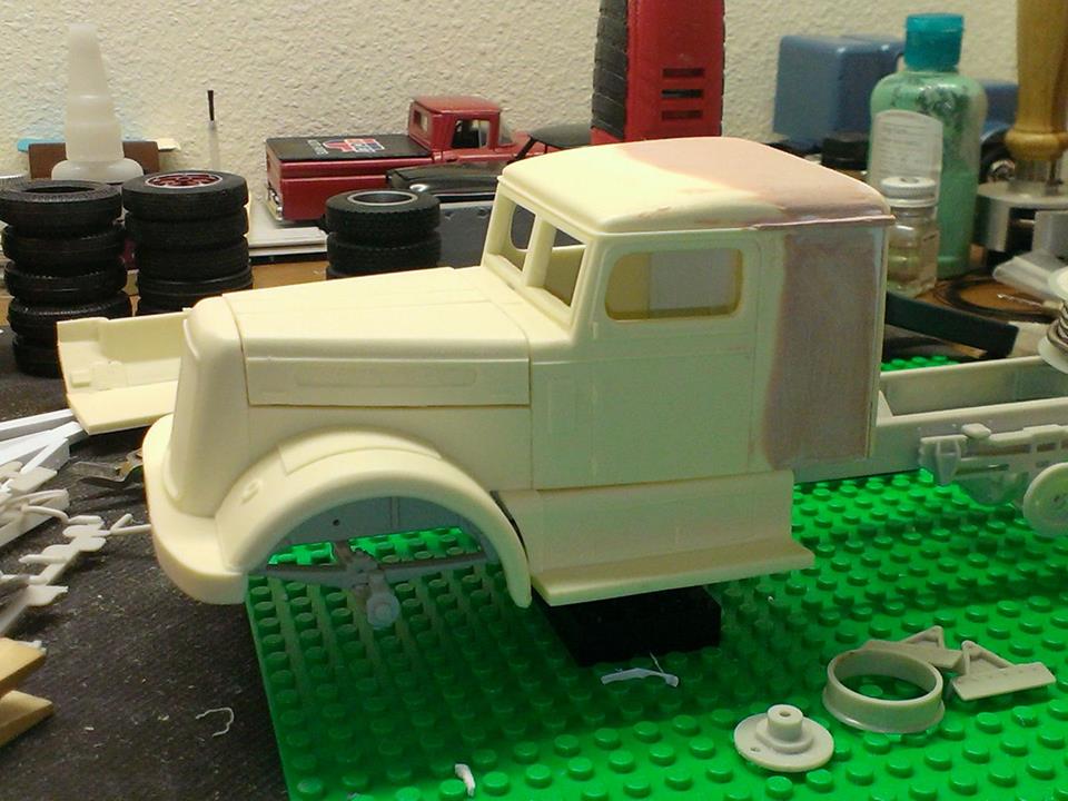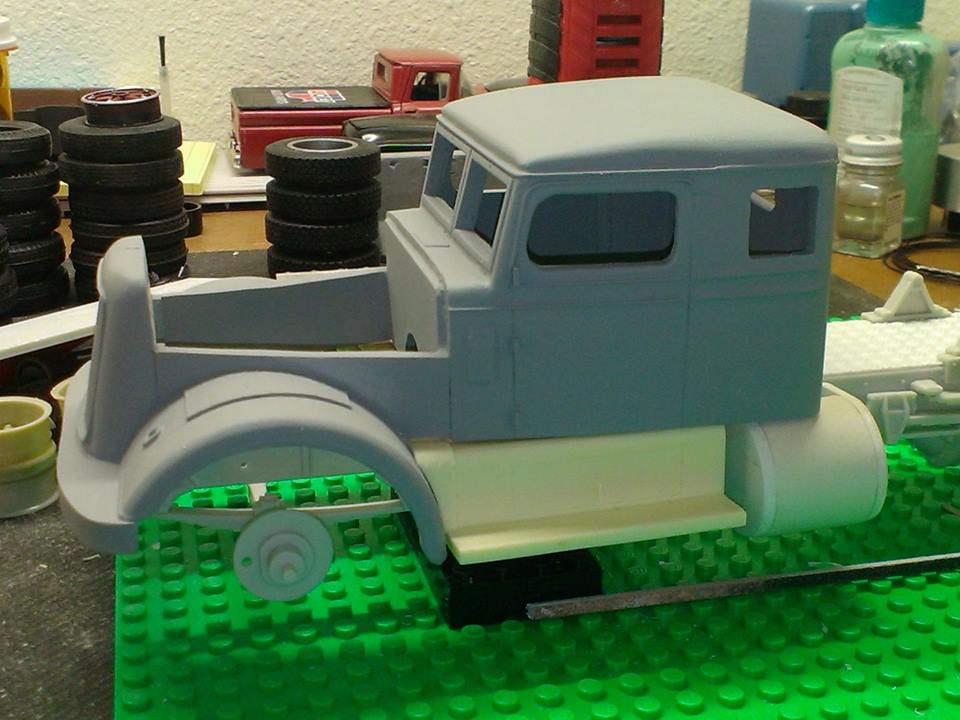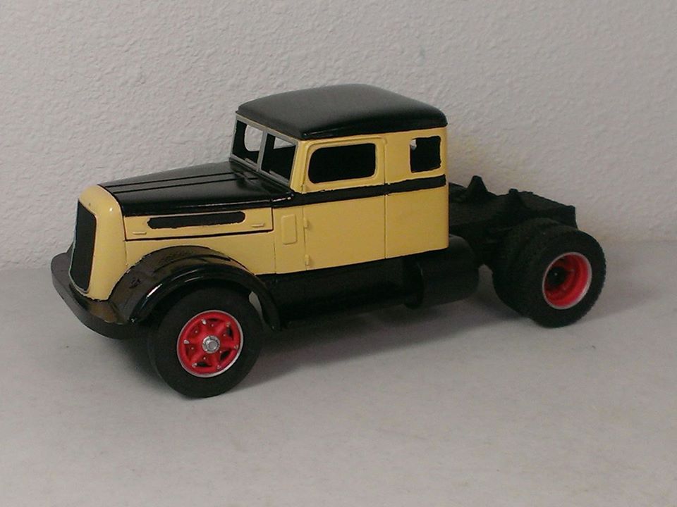 dsldriver Posted March 22, 2018 This started out with the AITM Corbitt kit. I used a shortened Louisville Short Hauler chassis. The engine will be an approximate replica of a Continental 22R gas engine that was used in most of these trucks. I cut the hood open and stretched the cab for the sleeper. The gas tanks are made from PVC plastic pipe with styrene ends. 1 Share this post Link to post Share on other sites