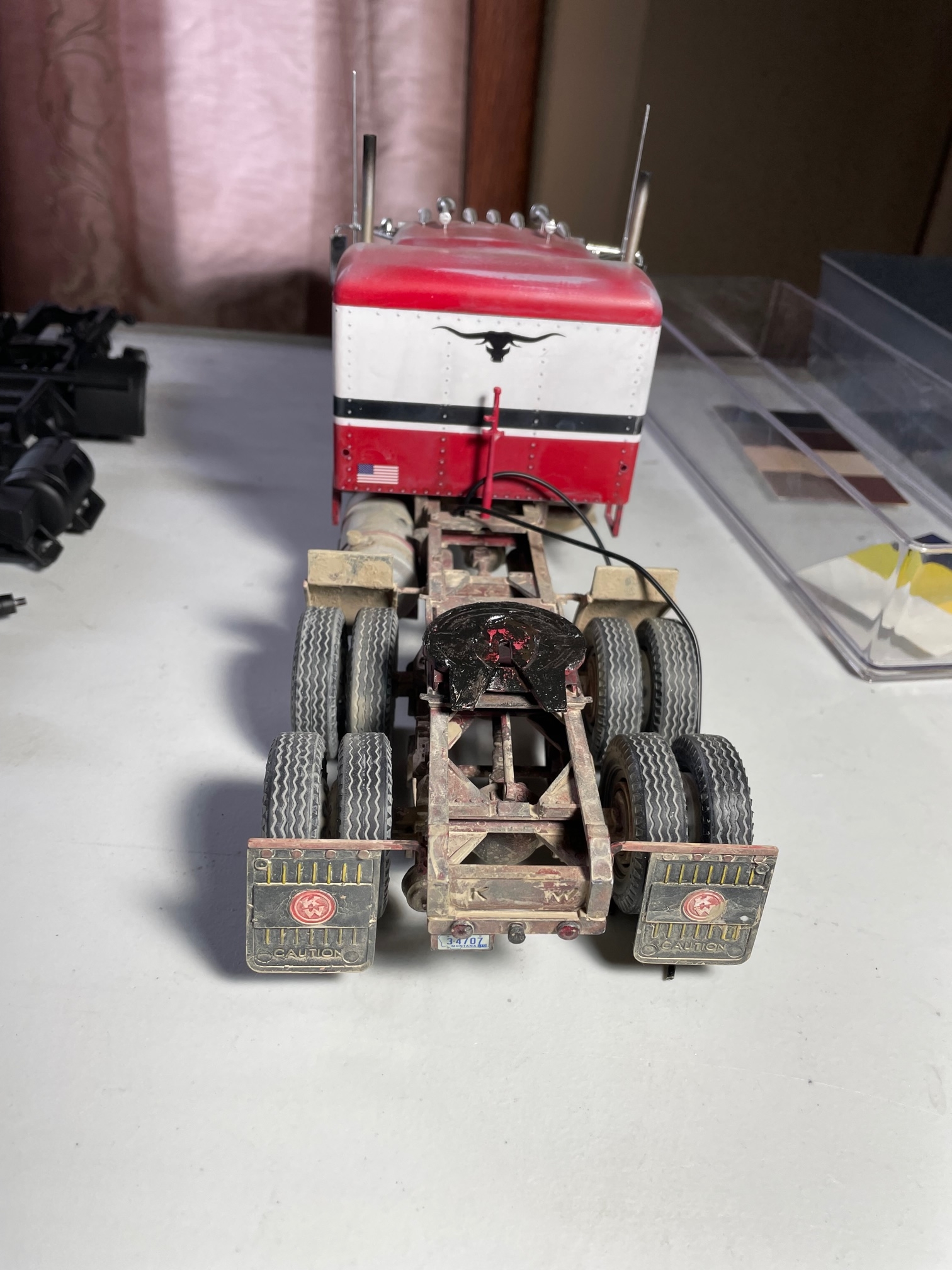 02fusoFG Posted April 22, 2023 The KW-925 is nearing the finish line. 5th wheel grease is Tamiya gray putty applied with a toothpick and then painted 50:50 X-1 black and X-9 brown. Not sure how to make the trailer air line hang "naturally". I want to keep this kit "stock". A bit of texture for gravel and mud splash was done with flocking and paint. Share this post Link to post Share on other sites