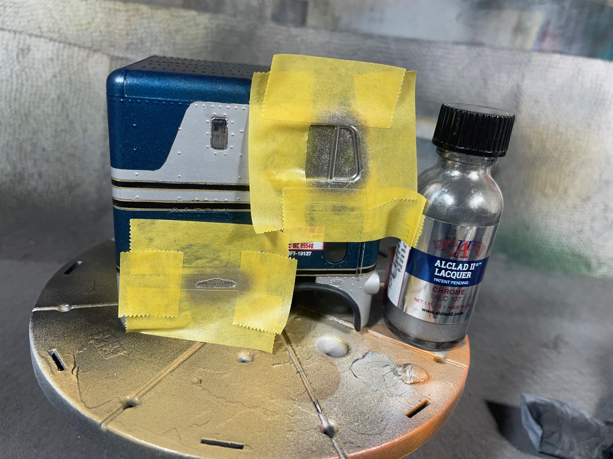 Up next is the paint trial. I don't want to risk ruining the cab. A template of styrene sheet was made to mask the body and try my hand at pinstripes.